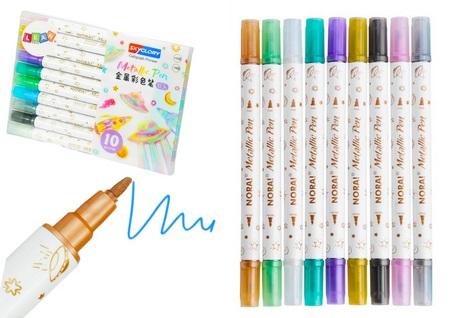Pisaki Metaliczne Flamastry Kolorowe Dwustronne Zestaw 10 ele. Zestawem 10 pisaków metalicznych, które zapewniają niesamowity efekt błysku i elegancji na papierze. Każdy pisak jest okrągły, co gwarantuje wygodne i precyzyjne rysowanie. Zestaw oferuje aż 10 różnych kolorów metalicznych, które doskonale rozświetlają każdą stronę. Pisaki są dwustronne: jedna strona jest wyposażona w cienką końcówkę, idealną do precyzyjnych detali i delikatnych linii, podczas gdy druga strona ma grubszą końcówkę, doskonałą do szerokich powierzchni i intensywnych, pełnych kolorów. Dzięki tej funkcjonalności, możesz swobodnie dostosować narzędzie do swoich potrzeb artystycznych. Całość zapakowana jest w przezroczyste pudełeczko, które umożliwia łatwe przechowywanie i szybki wgląd w dostępne kolory bez potrzeby otwierania opakowania. Ten zestaw to doskonały wybór dla każdego, kto pragnie dodać blasku i różnorodności do swoich prac artystycznych. Wymiary opakowania: 17 cm x 12 cm x 2 cm Zgodne z normą EN71 i certyfikatem CE. Przeznaczony dla dzieci powyżej 3 roku życia.