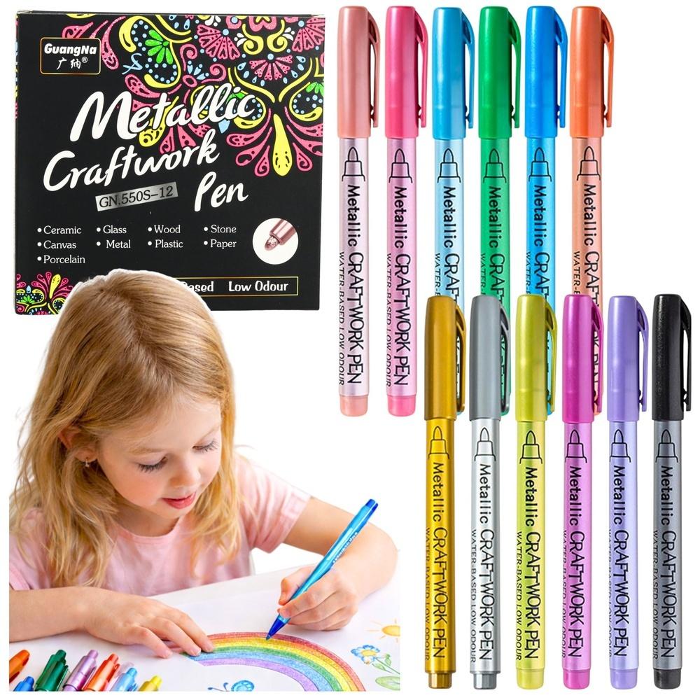 Zestaw 12 pisaków metalicznych to doskonałe narzędzie do tworzenia efektownych dekoracji, rysunków i projektów artystycznych. Intensywne, połyskujące kolory nadają pracom wyjątkowego charakteru, dzięki czemu świetnie sprawdzą się w scrapbookingu, kaligrafii, zdobieniu kartek okolicznościowych, kamieni, szkła, ceramiki oraz innych powierzchni.