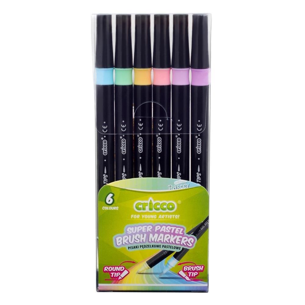 Dwustronne pisaki Cricco z jedną cienką końcówką w formie flamastra oraz drugą, miękką, pędzelkową końcówką. Z syntetycznego włosia, umożliwiającego przyjemne i precyzyjne kolorowanie. Pastelowe, delikatne kolory doskonale nadają się do dekoracji na różnych powierzchniach. Zestaw 6 kolorów w praktycznym, plastikowym etui.