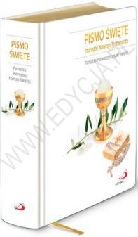 Najnowszy przekład Pisma Świętego z komentarzem opracowany przez Zespół Biblistów Polskich z inicjatywy Towarzystwa Świętego Pawła. Teraz do nabycia w pięknej obwolucie na wyjątkową okazję. Pismo Święte dla całej rodziny - pierwszy przekład w trzecim tysiącleciu. Idea i cechy najnowszego przekładu Pisma Świętego: Maksymalna wierność tekstowi oryginalnemu, z uwzględnieniem w tłumaczeniu zasad współczesnego literackiego języka polskiego. Dbałość o to, aby jak najlepiej oddać po polsku sens oryginalnego tekstu biblijnego. Uwzględnienie w tłumaczeniu i komentarzach do tekstu biblijnego współczesnych badań nad Pismem Świętym. Unikanie w przypisach i komentarzach specjalistycznego języka teologicznego. Umieszczenie przed każdą księgą, a także przed zbiorami ksiąg (np. Ewangelie) zwięzłych wprowadzeń, pozwalających czytelnikowi uchwycić kontekst powstania danej księgi lub zbioru ksiąg, a także istotę zawartej w nich treści. Nowoczesny i przejrzysty układ graficzny pozwalający sprawniej korzystać z Pisma Świętego, tzn.: - biała, estetyczna oprawa ze złotym wyciskiem, - przypisy z informacjami koniecznymi do zrozumienia tekstu biblijnego, umieszczone na zewnętrznych marginesach stron, - komentarze do poszczególnych fragmentów, na które podzielony jest tekst biblijny, ukazujące główne myśli oraz przesłanie w nich zawarte, - odnośniki do innych miejsc w Biblii, umieszczone na wewnętrznych marginesach stron, - skrócone nazwy ksiąg wraz z zakresami tekstu biblijnego, umieszczone w dolnych rogach stron, ułatwiające szukanie wybranego miejsca w Piśmie Świętym. - słownik wyjaśniający 186 terminów biblijnych, tablice chronologiczne i mapy, które przybliżają kontekst historyczny i geograficzny wydarzeń biblijnych.