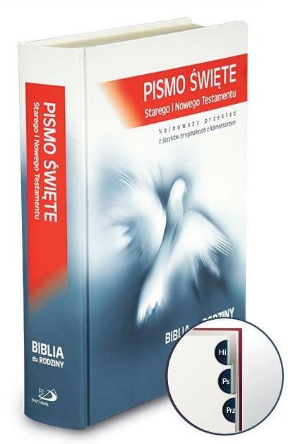 ismo Święte ST i NT. Biblia dla rodziny – format A4 z dużym drukiem z paginatorami W odpowiedzi na liczne prośby czytelników Biblii Paulistów, z myślą o polskich rodzinach, przygotowaliśmy wydanie dużym drukiem. Kierujemy je zarówno do osób starszych i słabowidzących, jak również młodszych członków rodziny. Mamy nadzieję, że ta nowa forma pomoże w zgłębianiu przesłania biblijnego i będzie zachętą do wspólnej lektury Pisma Świętego. Najnowszy przekład Pisma Świętego z komentarzem opracowany przez Zespół Biblistów Polskich z inicjatywy Towarzystwa Świętego Pawła (Biblia Paulistów) Cechy charakterystyczne Pisma Świętego w formacie A4: – Czytelna i powiększona czcionka tekstu biblijnego i komentarza. – Zaokrąglone rogi okładki zapewniające młodszym czytelnikom bezpieczne korzystanie z Biblii. – Uwzględnienie w tłumaczeniu i komentarzu do tekstu biblijnego współczesnych badań nad Pismem Świętym. – Komentarze do poszczególnych fragmentów biblijnych, ukazujące główne myśli oraz przesłanie w nich zawarte. – Unikanie w komentarzu specjalistycznego języka teologicznego. – Miejsce na wpisanie dedykacji. – Zwięzłe wprowadzenia do poszczególnych ksiąg biblijnych. – Nowoczesny i przejrzysty układ graficzny pozwalający na wygodne korzystanie z Pisma Świętego: * skrócone nazwy ksiąg wraz z zakresami tekstu biblijnego, umieszczone w górnych rogach stron, ułatwiające szukanie wybranego miejsca w Piśmie Świętym, * dwukolumnowy i dwukolorowy układ tekstu Biblii i komentarza, ułatwiający czytanie ze skupieniem. – Każdy egzemplarz zapakowany w kartonowe opakowanie zabezpieczające przed uszkodzeniem w transporcie. – 2 tasiemki.