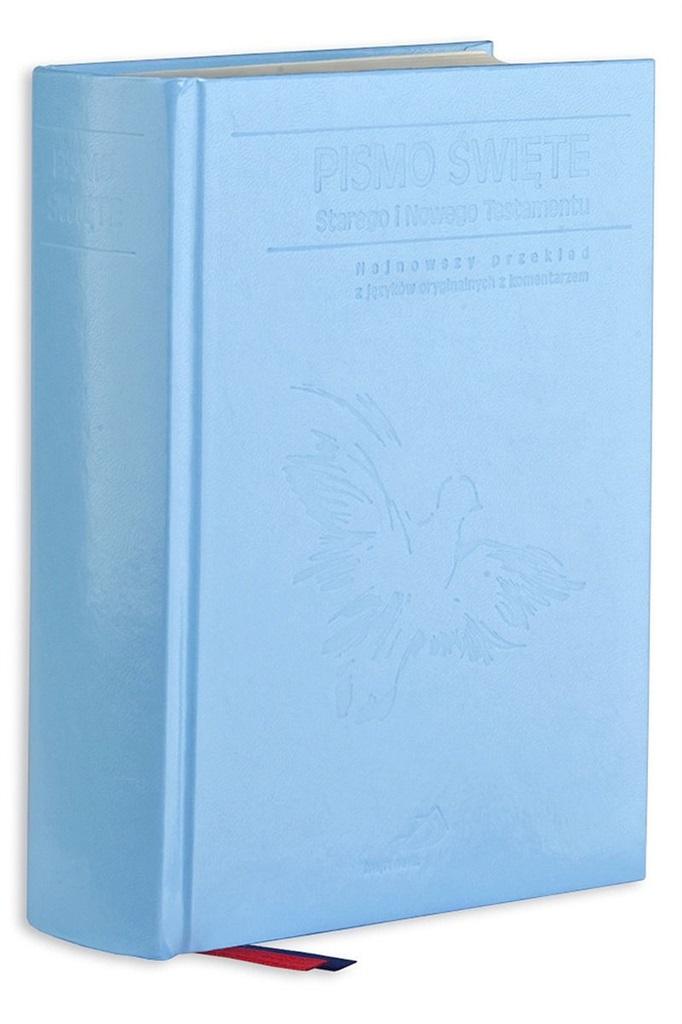 To wydanie Pisma Świętego wykończono twardą oprawą w spokojnym, błękitnym kolorze, który przywodzi na myśl wyciszenie i skupienie potrzebne do modlitwy. Delikatne tłoczenia w postaci gołębicy oraz napisów czynią ją gustowną i stylową. Wymiary 16 cm x 22 cm oraz czcionka 10,5 pkt sprawiają, że Pismo wygodnie i łatwo się czyta. Dodatkowe udogodnienie to paginatory - specjalne zakładki na marginesach ułatwiające wyszukiwanie fragmentów.