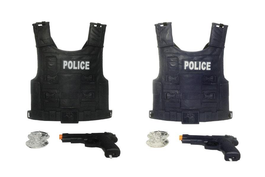 Zabawka z dźwiękami syreny policyjnej, strzelania, przeładowania broni oraz komendami policyjnymi w języku polskim: "Do wszystkich jednostek: Zgłaszam napad, ruszajmy do akcji", "Policja! Ręce do góry", "Stój, bo będę strzelał", "poddaj się, rzuć broń! Jesteś otoczony", "Jesteś aresztowany, jedziemy na komendę". W zestawie oprócz pistoletu znajduje się także m.in.: odznaka oraz kamizelka. Produkt działa na baterie typu AG10. Baterie znajdują się w zabawce. Zabaw