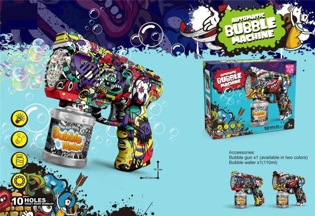 To, co najbardziej wyróżnia ten model, to jego odważna i nowoczesna estetyka. Obudowa pokryta intensywnym, komiksowym wzorem typu graffiti przyciąga wzrok i nadaje zabawce unikalnego charakteru, który spodoba się zarówno młodszym dzieciom, jak i tym szukającym bardziej "cool" akcesoriów. Ergonomiczna rączka idealnie pasuje do małych dłoni, zapewniając pewny chwyt nawet podczas najbardziej dynamicznych pościgów za bańkami.
