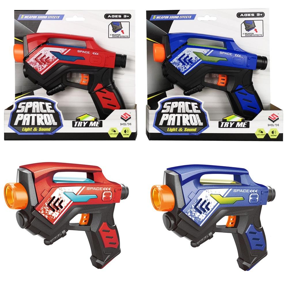 Pistolet w kolorze czerwonym lub niebieskim. Dźwięki i światło. Pistolet 17.5 x 4.5 x 14 cm Wymagane baterie - 2xAA (dołączone).