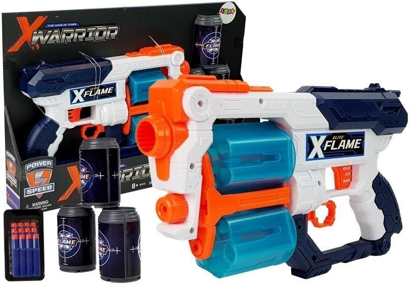 Karabin Pistolet Na Piankowe Strzałki Puszki Zasięg 18 m Biały Chcesz poćwiczyć celność ? Mamy idealny pistolet na piankowe naboje z dwoma magazynkami dla Ciebie! Rozpocznij zabawę z kolegami! Zabawki imitujące pistolety są elementami, które bardzo często występują w zabawach. Urozmaicają one zabawę, równocześnie pomagając w odegraniu różnorodnych scenariuszy zabaw. Są to także elementy ułatwiające wczucie się w rolę dzielnych wojowników i bohaterów rodem z filmów kryminalnych. Prezentowany karabin na naboje piankowe z pewnością zajmie czas na długie godziny, a także pozwoli na zaaranżowanie wielu ciekawych zabaw, na które pomysł podsunie im wyobraźnia. Pistolet posiada dwa magazynki, dzięki czemu można naraz załadować 12 pocisków. Każdy z magazynków posiada miejsce na 6 pocisków, aby zmienić magazynek wystarczy pociągnąć za wajchę przy rączce, umożliwi to załadowanie naboi. Zasięg strzału jest bardzo duży, bo aż 18 m! Wystarczy pociągnąć górną niebieską część do tyłu, aby załadować pocisk i nacisnąć spust. Puszki dołączone do zestawu będą celem! Elementy zestawu: - pistolet na pianki - amunicja piankowa 12 szt. - 3 puszki Wymiary karabinu: 33 cm x 19 cm x 6 cm Wymiary puszki: 10 cm x 5 cm Wymiary opakowania: 49 cm x 7 cm x 32 cm Pistolet przeznaczony jest dla wszystkich dzieci powyżej 8. roku życia. Został wykonany z atestowanych, bezpiecznych materiałów najwyższej jakości, dzięki czemu oznaczony jest certyfikatem CE, a jego produkcja jest zgodna z normą EN 71. Pistolet wraz z dołączonymi do zestawu akcesoriami zapakowany jest w estetyczne pudełko.