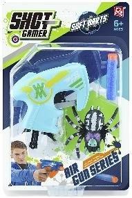 W zestawie: pistolet, 2 naboje, pająk cel, Funkcje: pistolet po naciśnięciu spustu wystrzeliwuje pocisk, pająk-cel po przyczepieniu do pionowej powierzchni pełza w dół, zabawa polega na strzelaniu do poruszających się celów, Pozostałe informacje: dł. pistoletu 13,5 cm, wym. opak. 29 x 19,5 x 4,5 cm, 6+