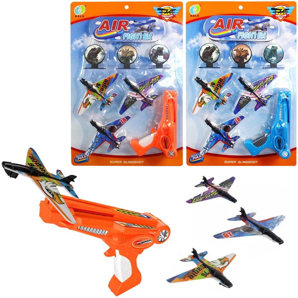 Pistolet - wyrzutnia. W zestawie 3 samoloty oraz 3 tarcze.
