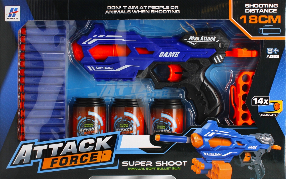Zalety produktu: pistolet lekki i wygodny w trzymaniu, miękkie i nie szkodliwe pociski piankowe, rozwijanie zdolności motorycznych i koncentracji, uczy zasad gry fair-play. Pistolet MEGA CREATIVE zapewni niezwykle emocjonującą zabawę każdemu dziecku, zarówno dużemu jak i małemu! Zawartość zestawu: pistolet, 14 zupełnie bezpiecznych piankowych pocisków, 3x tarcza beczka, magazynek na pociski. Strzałki trzeba umieścić w magazynku - po naciśnięciu spustu, nastąpi wystrzał z pistoletu. Nie należy strzelać do zwierząt! Zabawka wykonana z plastiku i pianki. Wymiary/waga/baterie: wymiary produktu (dł. x wys. x gł.)[cm] -pistolet 30x16x4, wymiary opakowania (dł. x wys. x gł.) [cm]: 45x28x5, waga produktu bez opakowania [kg]: 0,33 kg, waga produktu w opakowaniu [kg]: 0,54 kg, nie wymaga zasilania bateriami. Zestaw przeznaczony dla dzieci w wieku: 8+. Pakowany w kartonik z okienkiem.