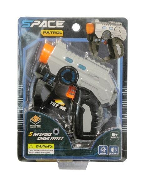 Plastikowy pistolet strzałki. Kiedy wciśniemy spust pistoletu produkt świeci kolorowym światełkiem oraz wydaje kosmiczne dźwięki strzelania. Zabawka działa na baterie typu AAA. Baterie nie są załączone do zabawki. Produkt dla dzieci od 3 lat. Zabawka zapakowana w kartonową podstawkę z przezroczstym kloszem. Podane wymiary są wymiarami opakowania.