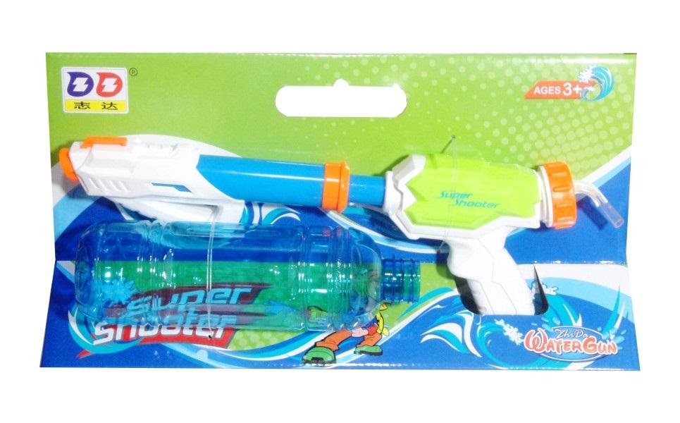 Plastikowy pistolet ze zbiornikiem na wodę. Zabawka dla dzieci od 3 lat. Podane wymiary są wymiarami opakowania. Produkt zapakowany w kartonowe opakowanie.