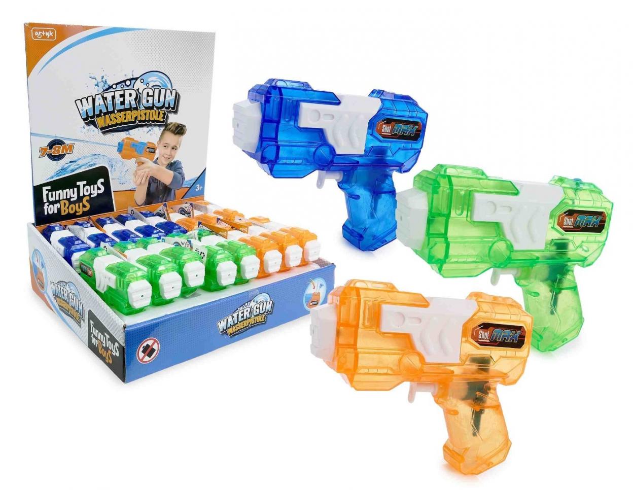 Opis: 16 szt/disp, 3 wzory, wym. pistoletu: 11 x 3,5 x 9,5 cm, nie wymaga baterii, wym. opakowania: 36 x 26,5 x 10 cm, 3+