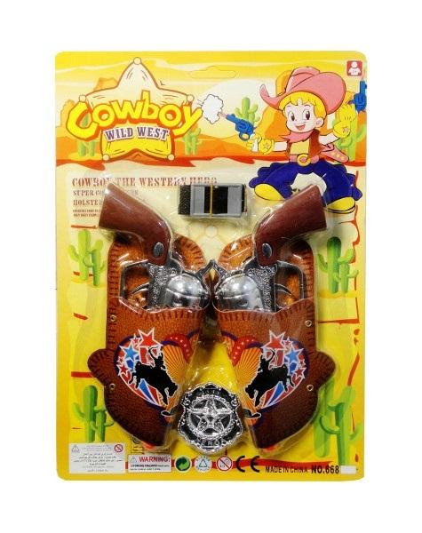 Pistolety kowbojskie w kaburze, z odznaką. Przydatne będą jako akcesorium kowboja na balu przebierańców. Produkt zapakowany w kartonową podstawkę z przezroczystym kloszem. Zabawka dla dzieci od 3 lat. Podane wymiary są wymiarami opakowania.