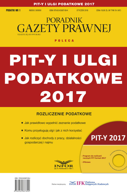 Komplet informacji – jak prawidłowo sporządzić zeznanie roczne za 2017 r. oraz skorzystać z ulg podatkowych. Publikacja składa się z instrukcji: • prawidłowego sporządzania PIT-8C, PIT-11 przez płatników, • poprawnego wypełniania PIT-28, PIT-36, PIT-36L, PIT-37, PIT-38, PIT-39 przez podatników oraz • korzystania z ulg podatkowych przysługujących podatnikom dokonującym rozliczenia rocznego (m.in. ulgi na dziecko, ulgi rehabilitacyjnej, ulgi mieszkaniowej, z tytułu wpłat na IKZE oraz darowizn). Opracowanie zawiera rozwiązania wielu problemów związanych z rozliczeniem rocznym, z którymi podatnicy spotykają się w praktyce. Szczególne miejsce w publikacji zajmuje tematyka ulg podatkowych omówionych w formie odpowiedzi na pytania podatników. Korzystanie z ulg może być w wielu wypadkach trudne, kontrowersyjne lub sporne. Na łamach publikacji podpowiemy, jak z nich skorzystać i uniknąć sporów. Publikacja została wzbogacona o konkretne przykłady liczbowe wraz z wypełnionymi zeznaniami PIT-28, PIT-36, PIT-36L, PIT-37, PIT -38, PIT-39. Do publikacji dołączona jest płyta z programem do rozliczeń rocznych.