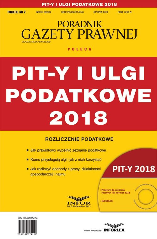 Komplet informacji – jak prawidłowo sporządzić zeznanie roczne za 2018 r. oraz skorzystać z ulg podatkowych. Publikacja składa się z instrukcji: • prawidłowego sporządzania PIT-8C, PIT-11 przez płatników, • poprawnego wypełniania PIT-28, PIT-36, PIT-36L, PIT-37, PIT-38, PIT-39 przez podatników oraz • korzystania z ulg podatkowych przysługujących podatnikom dokonującym rozliczenia rocznego (m.in. ulgi na dziecko, ulgi rehabilitacyjnej, ulgi mieszkaniowej, z tytułu wpłat na IKZE oraz darowizn). Opracowanie zawiera rozwiązania wielu problemów związanych z rozliczeniem rocznym, z którymi podatnicy spotykają się w praktyce. Szczególne miejsce w publikacji zajmuje tematyka ulg podatkowych omówionych w formie odpowiedzi na pytania podatników. Korzystanie z ulg może być w wielu wypadkach trudne, kontrowersyjne lub sporne. Na łamach publikacji podpowiemy, jak z nich skorzystać i uniknąć sporów. Publikacja została wzbogacona o konkretne przykłady liczbowe wraz z wypełnionymi zeznaniami PIT-28, PIT-36, PIT-36L, PIT-37, PIT -38, PIT-39. Do publikacji dołączona jest płyta z programem do rozliczeń rocznych.