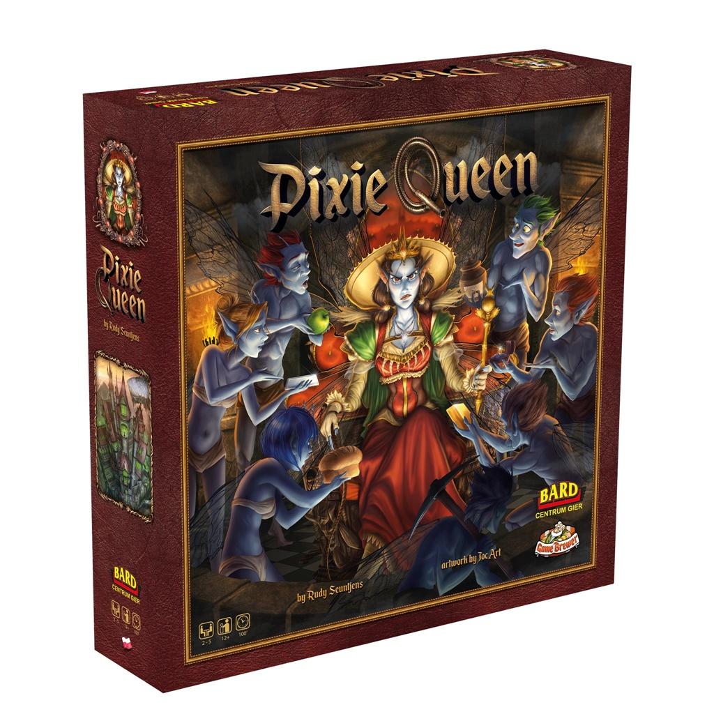 Witajcie w moim królestwie, nieposłuszne małe wróżki! Jestem wymagającą, acz miłościwą królową. Nie wymagam od was wiele. Oczekuję od was jedynie mojego kochanego złota i srebra, słodkiego miodu, soczystych jabłek i świeżego chleba... Co wy tu jeszcze robicie? Chyba wypowiedziałam się wystarczająco jasno?! Natychmiast idźcie i ukradnijcie te wszystkie dobra z Truro, pobliskiej wioski ludzi. Pamiętajcie jednak - jeśli mnie zawiedziecie, wrzucę was do ciemnej kopalni i tam w pocie czoła będziecie mogły przemyśleć swoje czyny, wydobywając złoto i srebro. Czy będziecie w stanie dostarczyć ukochanej Królowej najwspanialsze dary? Tylko wtedy was nie ukarzę... za bardzo. Wróżki są nieposłusznymi mitycznymi stworkami, żyjącymi głównie na terenach Kornwalii i Devon. Bez przerwy oszukują i okradają ludzi. Nie robią tego jednak dla własnej przyjemności, lecz ze strachu przed swoją Królową, która rządzi poddanymi żelazną ręką, domagając się przy tym ciągłych podarunków. W Pixie Queen od dwóch do pięciu graczy wcieli się w role przywódców wróżek, próbujących prześcigać się w wynajdowaniu sposobów na zadowolenie swojej Królowej. W każdej rundzie będą gromadzić srebro, złoto i jedzenie na ofiarę ku jej czci. W zamian zostaną nagrodzeni złotymi pierścieniami, a co sprytniejsi spróbują zaskoczyć ją specjalną ofiarą. Może się nawet zdarzyć, że dołączą do niej w pałacu jako Lojalny Służący. Jednak Królową nie tak łatwo zadowolić. Ci, których praca nie będzie wydajna, otrzymają punkty karne. Aby wyjść na swoje, będziecie musieli zebrać ich jak najmniej Na koniec gry można je będzie zniwelować przy pomocy punktów zwycięstwa, zdobywanych w trakcie rozgrywki. Jeżeli uda Wam się ukończyć grę z dodatnim wynikiem, to znak, że świetnie się spisaliście! Cel gry Otrzymaj od Królowej jak najmniej karnych punktów, gromadząc przy tym jak najwięcej Punktów Zwycięstwa. Punkty Karne mają wartość ujemną i po otrzymaniu są natychmiastowo zaznaczane na torze punktacji, poprzez przesuwanie znacznika w stronę zgodną z ruchem wskazówek zegara. Punkty Zwycięstwa mają wartość dodatnią, ale zaznaczane są na torze punktacji dopiero podczas zakończenia gry. Zwycięzcą zostanie gracz z największą liczbą punktów, ale pamiętajcie, że wejście na dodatnią stronę toru punktacji jest trudne! Jeżeli wam się uda, to udowodnicie wszystkim, że jesteście Wielką Wróżką (duchem, bo ciałem wciąż zostaniecie malutcy). Zawartość pudełka: 5 Zestawów gracza: 1 Zasłonka, 5 Wróżek, 4 Żetony Akcji, 2 Małe i 1 Duży Żeton, 1 Mały i 1 Duży Znacznik Kolejki (sześciany) 1 Plansza 3 Płytki Zdolności Jednorazowych 40 Jabłek 7 Płytek Ofiara 9 Płytek Rund 40 Bochenków Chleba 7 Płytek Lojalny Służący 1 Sakwa Kopalni 40 Garnuszków Miodu 7 Płytek Złoty Pierścień 1 Kość Zasobów 60 Sztabek Srebra 10 Płytek Nagród (5 o wartości 1, 5 o wartości 2) 1 Kość Kar 30 Sztabek Złota 10 Płytek Zdolności Stałych 20 Skał - 6 Płytek Jedzenia - 1 Arkusz Naklejek Liczba graczy: 2 - 5 osób Wiek: od 12 lat Czas gry: ok. 60 - 120 minut