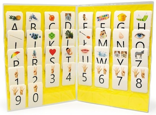 Zestaw kartoników z cyframi i literami drukowanymi (wielkimi i małymi) oraz ilustracjami wyrazów podstawowych. Do zestawu dołączono klaser, dzięki któremu porządkowanie i odszukiwanie potrzebnych liter i cyfr zawsze będzie łatwe.