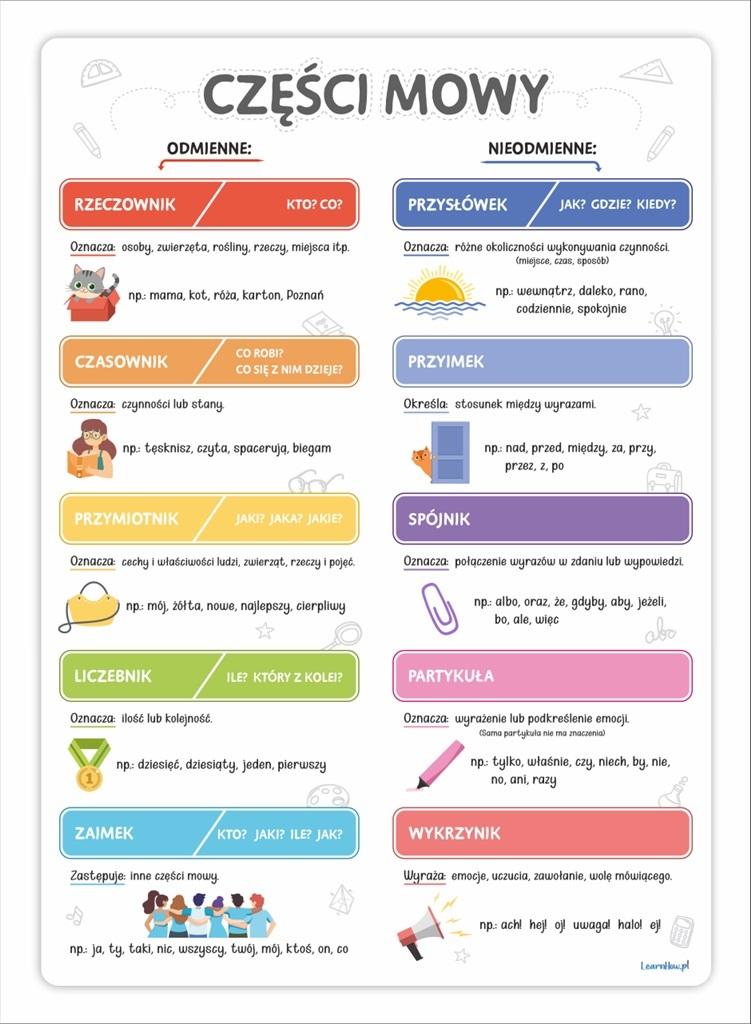 Świetny sposób na przypomnienie podstawowych zasad i przykładów Części Mowy.