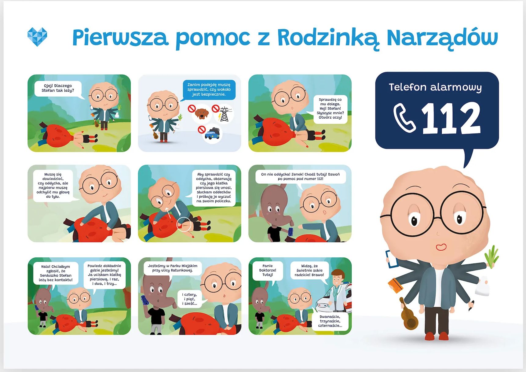 ŚWIETNA POMOC NAUKOWA Plansza przedstawia w prosty sposób najważniejsze elementy pierwszej pomocy, które powinno znać każde dziecko.