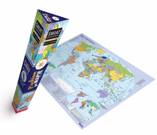 Świat - polityczna mapa ścienna w skali 1 : 60 000 000. Główną treścią tej mapy jest podział polityczny współczesnego świata. Dlatego obszary państw i terytoriów zależnych są wyróznione różnymi kolorami. Obszary te są czytelnie podpisane, a ich stolice wyraźnie wskazane.  Ważnym uzupełnieniem są dwie mapy w mniejszych skalach: obrazujące sojusze gospodarcze i polityczne we współczesnym świecie. Na odwrocie znajduje się kolorowa mapa konturowa, na której można się sprawdzić (z zapamiętania podstawowych informacji) dodając podpisy państw, stolic, rzek, mórz itd. wykorzystując dołączonego do zestawu pisaka suchościeralny. Mapa dwustronna z kolorową mapą konturową