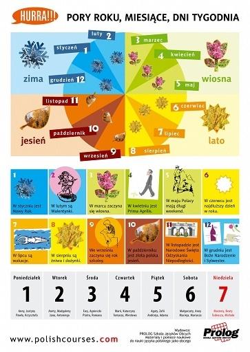 Plakat ""Pory roku, miesiące, dni tygodnia"", stanowiący niezwykle przydatną pomoc dydaktyczną dla nauczyciela języka polskiego jako obcego, ozdobi ścianę pracowni i pomoże w m.in. opanowania nazewnictwa z zakresu nazw pór roku, miesięcy i dni tygodnia.