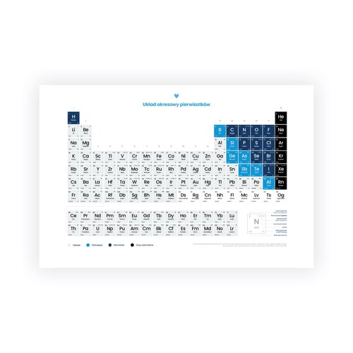 NOWOCZESNY STYL Plakat na ścianę Układ okresowy pierwiastków chemicznych to nie tylko praktyczna pomoc naukowa, ale także ciekawa dekoracja Twojego pokoju! Nowoczesny design i kolorystyka sprawiają, że układ świetnie komponuje się praktycznie w każdym wnętrzu.