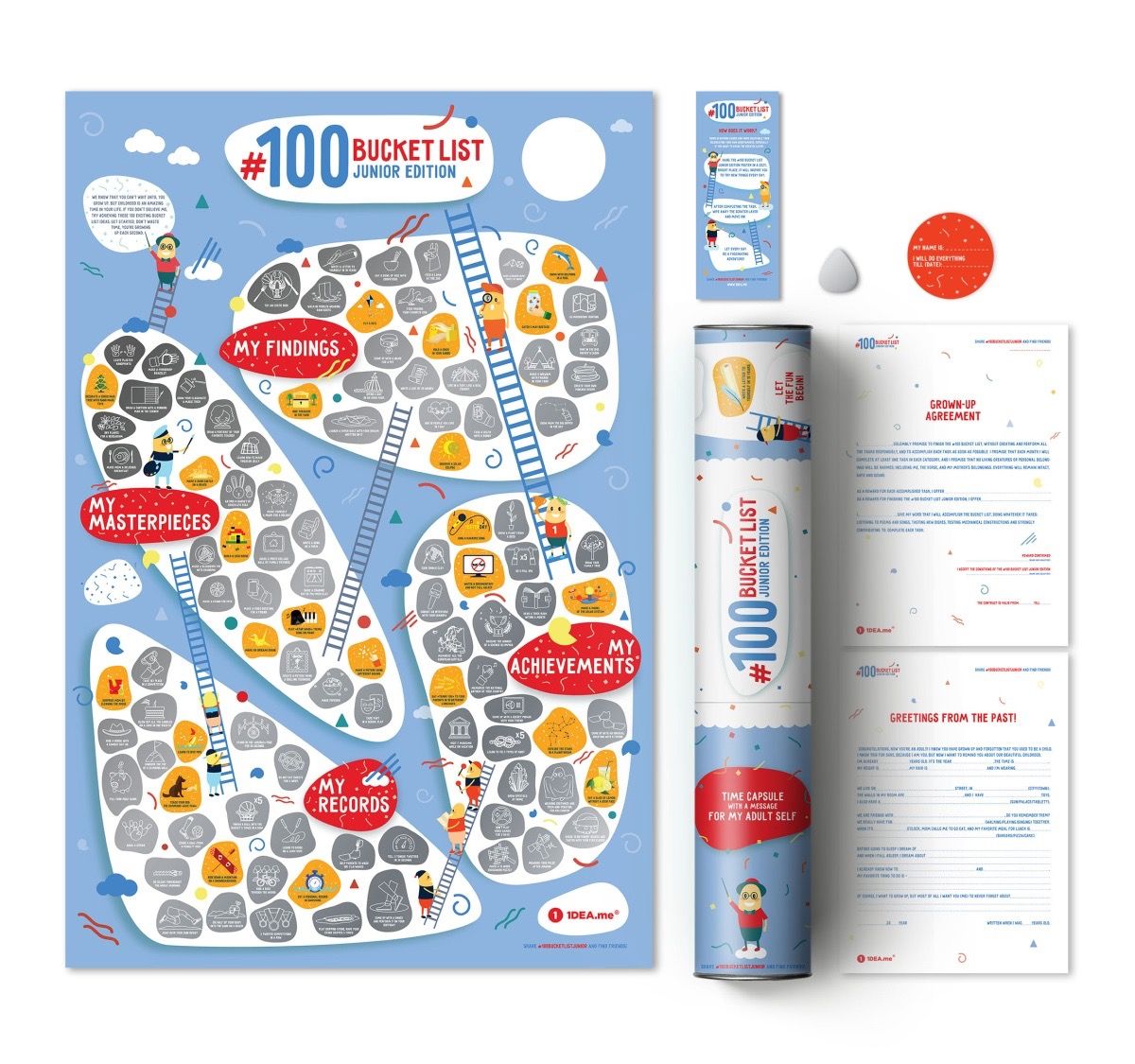 100 BUCKETLIST Junior Edition to wspaniale zaprojektowany interaktywny plakat ze 100 rzeczami, których każde dziecko powinno spróbować w życiu aby odkryć swoje zainteresowania i talenty. Zdrapuj kolejne pola, wypełniaj zadania i odkrywaj swoje pasje.