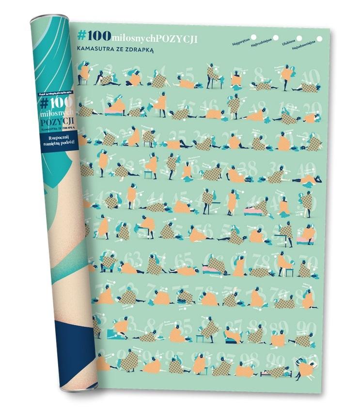 #100miłosnychPOZYCJI to zaprojektowany z dużym rozmachem plakat interaktywny prezentujący 100 pozycji seksualnych, które wprowadzą Was w nowy wymiar namiętności. Eksperymentujcie w łóżku, zdrapujcie kolejne pola i rozkochajcie się w sobie na nowo.