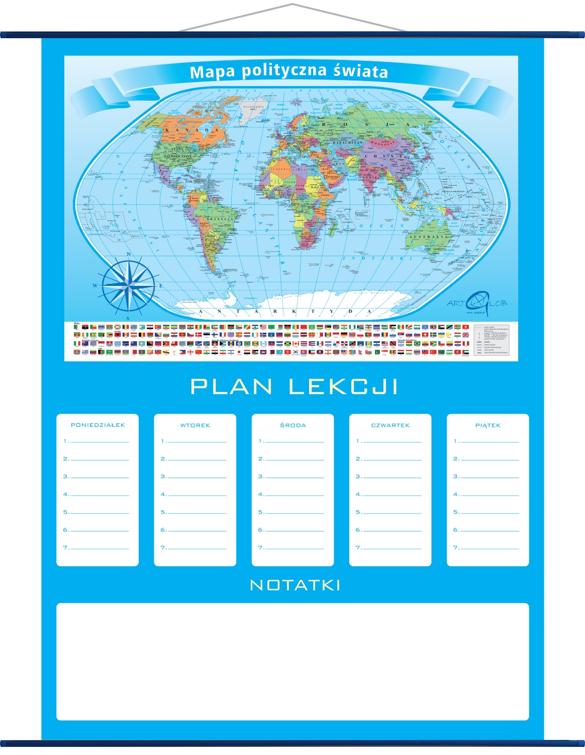 Plan lekcji z polityczną mapą Świata, może pełnić rolę zarówno edukacyjną, jak i zabawową. Na obrazku zaznaczono barwnie kontynenty, naniesiono nazwy państw i stolic. Dzięki temu mapa jest fascynującym źródłem wiedzy o naszej planecie. Przekazuje w ciekawy sposób informacje z zakresu geografii. Pobudza wyobraźnię, zachęca do zdobywania wiedzy i inspiruje. Jakość i estetyka wykonania sprawiają, że stanowi idealny pomysł na prezent. W przejrzysty sposób pozwala zapisać plan zajęć dziecka.