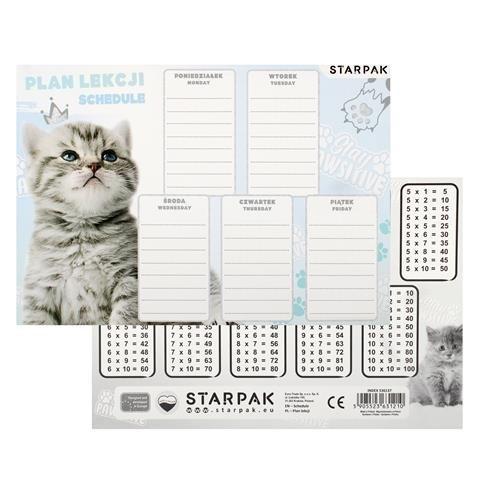 Plan lekcji jest niezbędnym elementem wyposażenia szkolnej wyprawki. Plan z kolekcji STARPAK Cuties Kotki, zawiera podział na pięć dni tygodnia z 8 wierszami do wpisu, dzięki czemu żaden uczeń nie zapomni o potrzebnych mu danego dnia książkach czy zeszytach, dodatkowo na odwrotnej stronie posiada tabliczkę mnożenia. Przyjazna grafika sprawi, że każdy dzień w szkole będzie dobrze zaplanowany i udany. Zapoznaj się również z innymi produktami Starpak! Plan lekcji wykonany z papieru. Wyprodukowany w Polsce. Pakowany w folię po 25 sztuk. Wymiary produktu(szer. x wys.) [cm]: 23x16. Waga produktu w opakowaniu [kg]: 0,23 kg.