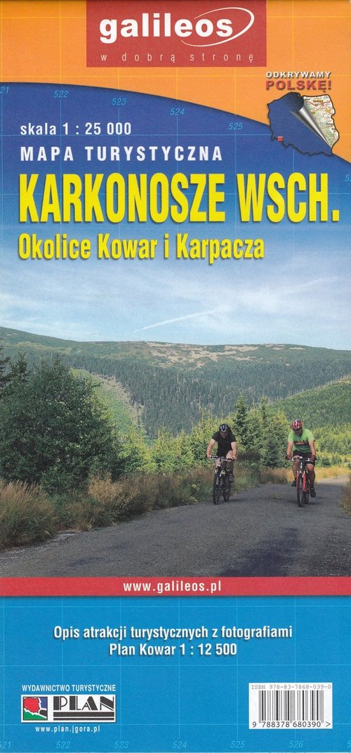 Szczegółowa mapa turystyczna wschodniej części Karkonoszy z opisem najważniejszych atrakcji. Na rewersie mapy plan Kowar z Parkiem Miniatur Zabytków Dolnego Śląska. Na mapie można znaleźć m.in. : znakowane szlaki turystyczne, czasy przejść poszczególnych szlaków, ścieżki rowerowe, szlaki narciarskie, szlak koński, nartostrady i stoki narciarskie, muzea, teatry, kina, zabytki, schroniska turystyczne, hotele, gospodarstwa agroturystyczne.