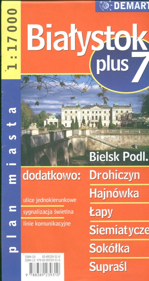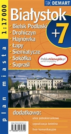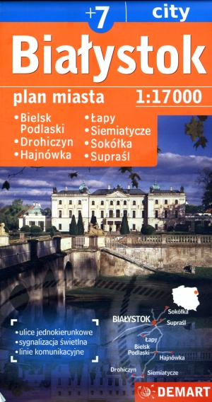 Plan Białegostoku w skali 1:17 000 plus centrum w skali 1:7 500, wzbogacony o plany najważniejszych miast w okolicy. Mapa okolic w skali 1:550 000 - Ulice jednokierunkowe - Sygnalizacja świetlna - Linie komunikacyjne - Spisy ulic i informacje teleadresowe - Szlaki turystyczne i ścieżki rowerowe.