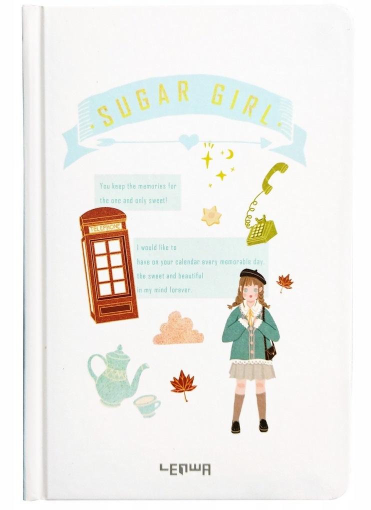 Planer B6 w twardej oprawie z błękitnym grzbietem i napisem: Sugar girl. Niebanalna okładka z wieloma rysunkami i napisami. Posiada 112 szytych kartek gładkich, w linie i w kropki oraz tygodniowy planer i materiałową zakładkę.