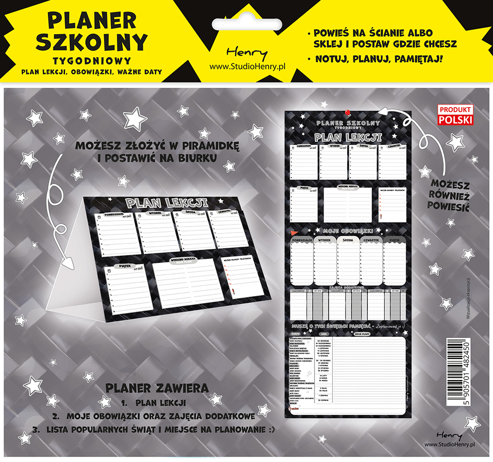 Planer składa się z trzech stron użytkowych, na każdej ze stron: Plan lekcji, Moje obowiazki i zajęcia dodatkowe, Lista ważnych dat do zaplanowania, wszystko w jednym miejscu.Format trójstronnej piramidki 160x210mm po sklejeniu do użytku w wersji stojącej, bez klejenia do użytku w wersji ściennej 160x516mm.