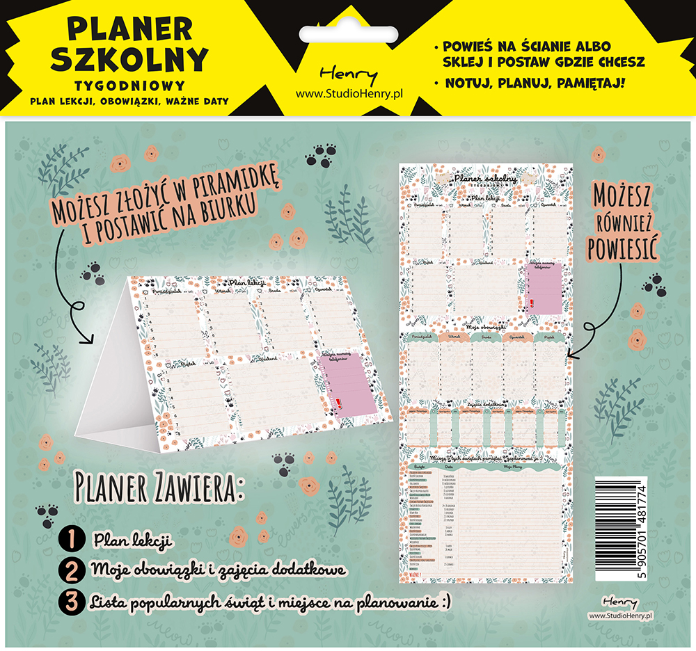 Planer składa się z trzech stron użytkowych, na każdej ze stron: Plan lekcji, Moje obowiazki i zajęcia dodatkowe, Lista ważnych dat do zaplanowania, wszystko w jednym miejscu.Format trójstronnej piramidki 160x210mm po sklejeniu do użytku w wersji stojącej, bez klejenia do użytku w wersji ściennej 160x516mm.