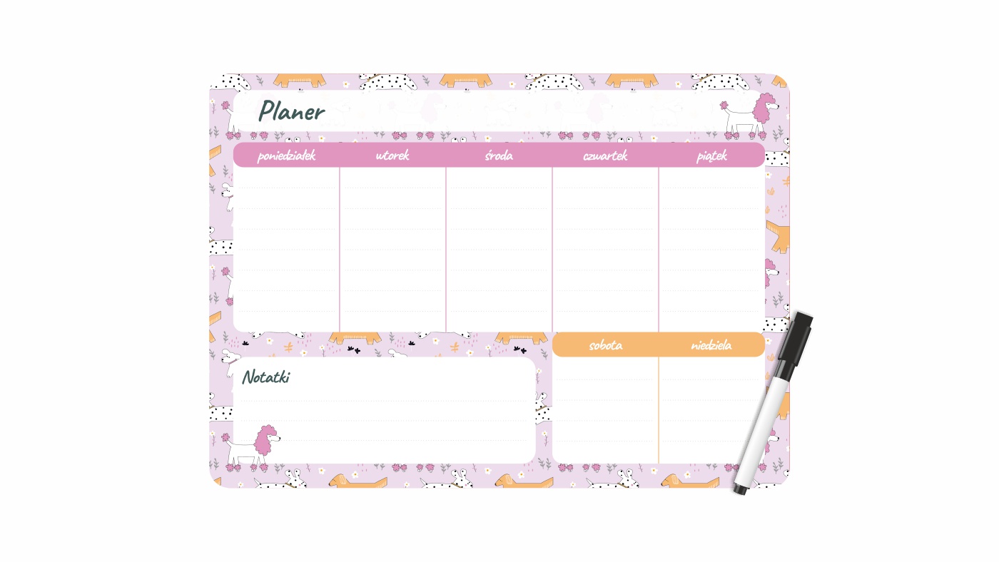 Planer na lodówkę z motywem z Kolekcji nadruków. Wyposażony w magnetyczny podkład, dzięki któremu można umieścić go na lodówce, jak i każdej innej powierzchni metalowej. Układ tygodniowy znacznie ułatwi zaplanowanie najważniejszych wydarzeń tygodnia czy też zanotowanie planu lekcji dziecka. Powierzchnia suchościeralna pozwala na wielokrotne użycie planera (zalecamy stosowanie akcesoriów do tablic suchościeralnych). Nadaje się zarówno do domu, szkoły czy biura. GRATIS dedykowany, czarny marker z magnesem i gąbką.