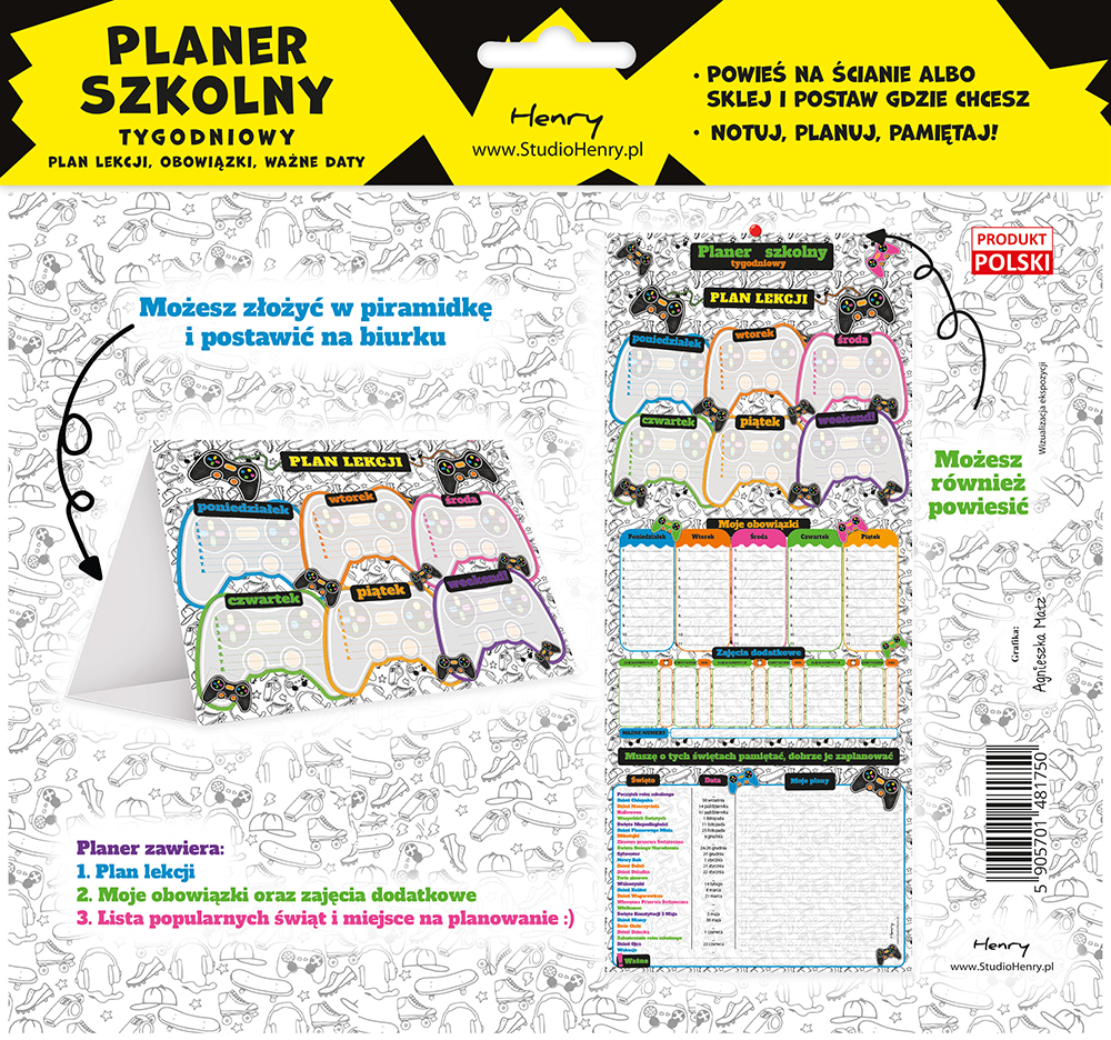 Planer składa się z trzech stron użytkowych, na każdej ze stron: Plan lekcji, Moje obowiazki i zajęcia dodatkowe, Lista ważnych dat do zaplanowania, wszystko w jednym miejscu.Format trójstronnej piramidki 160x210mm po sklejeniu do użytku w wersji stojącej, bez klejenia do użytku w wersji ściennej 160x516mm.