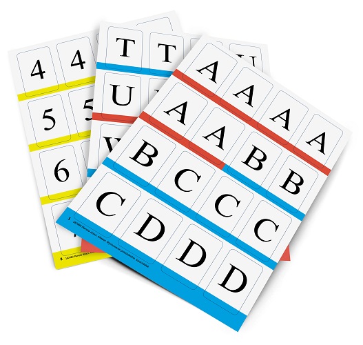 Zestaw kartoników z 24 podstawowymi wielkimi i małymi literami drukowanymi oraz 10 liczbami (0-9) i znakami większości, mniejszości i równości.