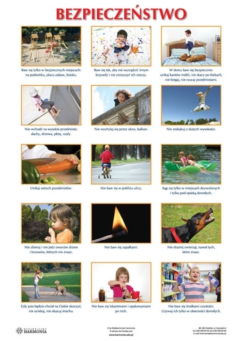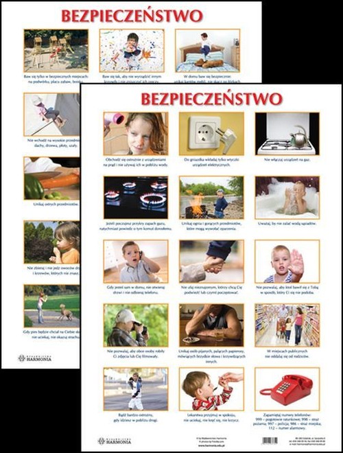 Prezentujemy Państwu plansze edukacyjne dla przedszkoli i klas 1–3. Jest to zestaw pomocy dydaktycznych, które przydadzą się w każdej klasie i sali przedszkolnej. Tematyka plansz jest zgodna z programem nauczania i dotyczy rzeczy bliskich dziecku. Dzięki wyrazistym ilustracjom i zdjęciom tablice w przyjazny sposób przedstawiają realia naszego świata. Poszczególne wzory sprawdzą się w dekorowaniu klasy lub pokoju dziecka, zwłaszcza jeśli ma już ono swoje zainteresowania. Na planszy tej przedstawiono trzydzieści przestróg, których dzieci muszą przestrzegać, by być bezpiecznymi. W sposób delikatny ostrzegają one przed niebezpieczeństwami ze strony przyrody, elektryczności, innych ludzi itp. Ważnym elementem planszy jest czerwony telefon, pod którym znajdują się najważniejsze telefony alarmowe.