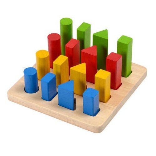 Drewniana plansza z 16 klockami w 4 różnych kształtach, kolorach i wielkościach. Kolorowe elementy można sortować, liczyć i dopasowywać do otworów w planszy. Wiek: 2+