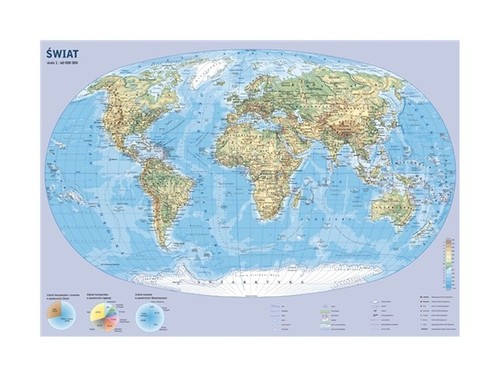 Świat - mapa ścienna w skali 1 : 60 000 000 - fizyczno-polityczna. Przejrzystemu obrazowi ukształtowania lądów i oceanów towarzyszą takie elementy treści jak: główna sieć rzeczna i najważniejsze jeziora, opisy ważniejszych krain geograficznych, wysp, półwyspów, mórz, basenów i grzbietów oceanicznych. Stolice państw oraz wielkie miasta, a także granice krajów i terytoriów zależnych dopełniają obraz współczesnego świata. Mapa świetnie sprawdzi się w nauce położenia krajów i ich stolic oraz krain, a także mórz wysp i oceanów. - Oprawa z wygodną zawieszką - wzmocniona listwami - łatwo zmywalna - dostosowana do pisaka