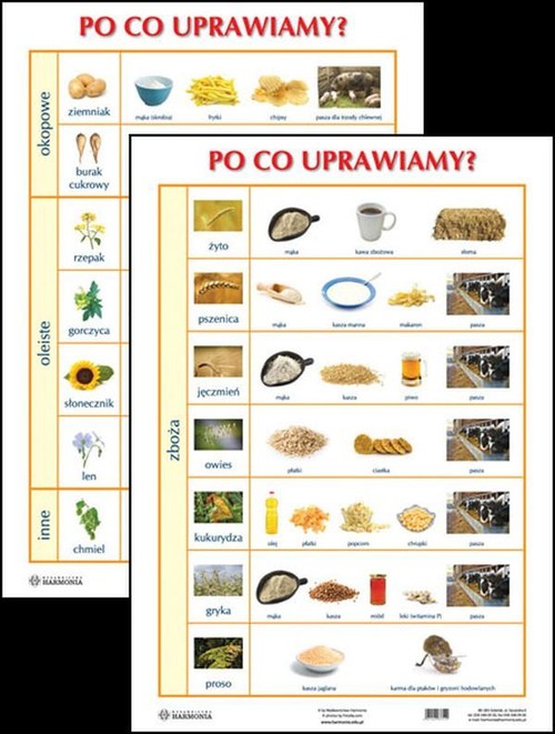 PO CO UPRAWIAMY?♦ format 61 cm x 86 cm♦ dwustronnie zalaminowane♦ wieloletnia trwałośćPrezentujemy Państwu plansze edukacyjne dla przedszkoli i klas 1-3. Jest to zestaw pomocy dydaktycznych, które przydadzą się w każdej klasie i sali przedszkolnej.Tematyka plansz jest zgodna z programem nauczania i dotyczy rzeczy bliskich dziecku. Dzięki wyrazistym ilustracjom i zdjęciom tablice w przyjazny sposób przedstawiają realia naszego świata. Poszczególne wzory sprawdzą się w dekorowaniu klasy lub pokoju dziecka, zwłaszcza jeśli ma już ono swoje zainteresowania.Prezentowana tu plansza prezentuje produkty, które powstają z roślin uprawnych. Przy nazwach roślin znajdują się fotografie przedstawiające wygląd kłosa, owocu lub bulwy przed przetworzeniem. Jest to ważne, bo często dzieci nie wiedzą, jak wyglądają na przykład konkretne zboża.
