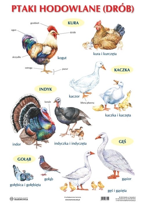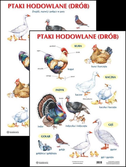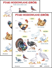 Prezentujemy Państwu plansze edukacyjne dla przedszkoli i klas 1-3. Jest to zestaw pomocy dydaktycznych, które przydadzą się w każdej klasie i sali przedszkolnej.Tematyka plansz jest zgodna z programem nauczania i dotyczy rzeczy bliskich dziecku. Dzięki wyrazistym ilustracjom i zdjęciom tablice w przyjazny sposób przedstawiają realia naszego świata. Poszczególne wzory sprawdzą się w dekorowaniu klasy lub pokoju dziecka, zwłaszcza jeśli ma już ono swoje zainteresowania.Na planszy przedstawiono najpopularniejsze ptaki hodowlane. Ilustracje pokazują wygląd samców, samic i piskląt. Zostały na niej wskazane także najważniejsze części budowy ptaków. Na odwrocie planszy znajdują się ilustracje bez podpisów. Zadaniem dziecka jest wskazanie par zwierząt i nazwanie ich.