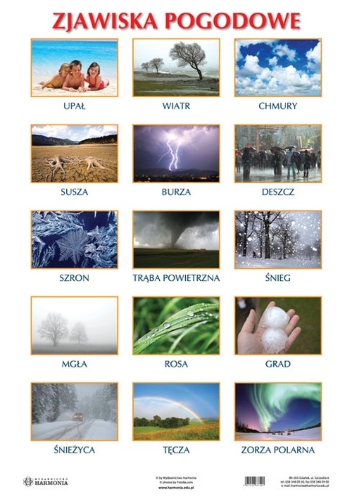 Prezentujemy Państwu plansze edukacyjne dla przedszkoli i klas 1-3. Jest to zestaw pomocy dydaktycznych, które przydadzą się w każdej klasie i sali przedszkolnej.Tematyka plansz jest zgodna z programem nauczania i dotyczy rzeczy bliskich dziecku. Dzięki wyrazistym ilustracjom i zdjęciom tablice w przyjazny sposób przedstawiają realia naszego świata. Poszczególne wzory sprawdzą się w dekorowaniu klasy lub pokoju dziecka, zwłaszcza jeśli ma już ono swoje zainteresowania.Plansza ta pozwoli lepiej poznać przyrodę i sposoby dbania o nią. Zdjęcia przedstawiają piętnaście zjawisk pogodowych. Druga plansza to piętnaście rzeczy, które możemy zrobić dla naszej planety. Dzięki jasnej wymowie zdjęć można nawet małe dziecko nauczyć podstaw ekologii.