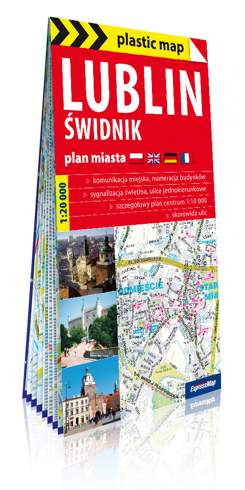 Lublin i Świdnik Puby i restauracje w zabytkowych kamieniczkach, podziemna trasa biegnąca piwnicznymi zakamarkami Starego Miasta i pełna bizantyjskich fresków kaplica św. Trójcy. W Lublinie na turystów czeka wiele atrakcji. Dwustronnie foliowany, trwały plan pomoże w ich odkrywaniu. Na planie m.in.: • szczegółowy rysunek zabudowy wraz z numeracją budynków wzdłuż ulic i na osiedlach, • linie autobusowe i trolejbusowe wraz z przystankami, • sygnalizacja świetlna, ulice jednokierunkowe, parkingi, • bogata treść turystyczna, w tym zabytki, muzea, szlaki turystyczne, rezerwaty przyrody, hotele i inne istotne obiekty, • budynki użyteczności publicznej, centra handlowe, • szczegółowy plan centrum Lublina w skali 1:10 000 (1 cm – 100 m), • mapa okolic Lublina w skali 1:200 000 (1 cm – 2 km), • skorowidz ulic.