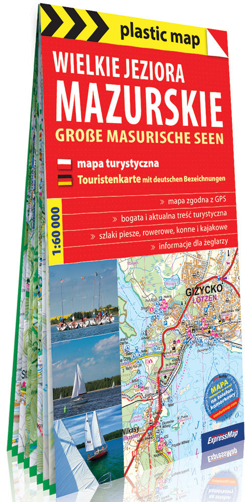 Wielkie Jeziora Mazurskie Dwustronnie foliowana, trwała mapa turystyczna Krainy Wielkich Jezior Mazurskich obejmuje obszar od Węgorzewa na północy po Jezioro Nidzkie na południu. Publikacja została opracowana we współpracy z doświadczonymi krajoznawcami z regionu. Cechy mapy: - dogodna zarówno dla pieszego, rowerzysty, jak i żeglarza, skala 1:60 000 (1 cm – 600 m), - bogata treść turystyczna, - zgodność z GPS – współrzędne geograficzne w układzie WGS-84 Na mapie m.in.: - szlaki piesze i rowerowe, szlaki kajakowe, szlaki żeglugi pasażerskiej, - baza noclegowa, w tym hotele, kempingi, stanice wodne, - treść żeglarska, w tym głębokości jezior, przeszkody i mielizny, przystanie i pomosty, slipy i dźwigi, warsztaty szkutnicze, - muzea, zabytki, bunkry i inne interesujące obiekty, - parki krajobrazowe, rezerwaty przyrody, atrakcje przyrodnicze, - niemieckie nazwy (miejscowości, jezior, rzek, itp.) sprzed II wojny światowej, niemieckie współczesne opisy obiektów - poziomice i cieniowanie pokazujące ukształtowanie terenu.