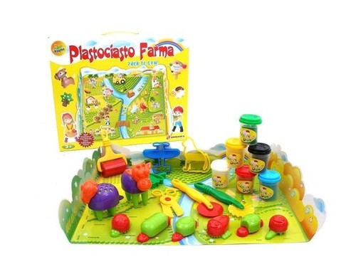 Plastociasto - zestaw farma Zawartość: , 6 pojemników plastociasta, 18 elementów: podkładka, foremki, wałek, nożyczki, nóżki, szpatułka Dla dzieci w wieku od 3 lat