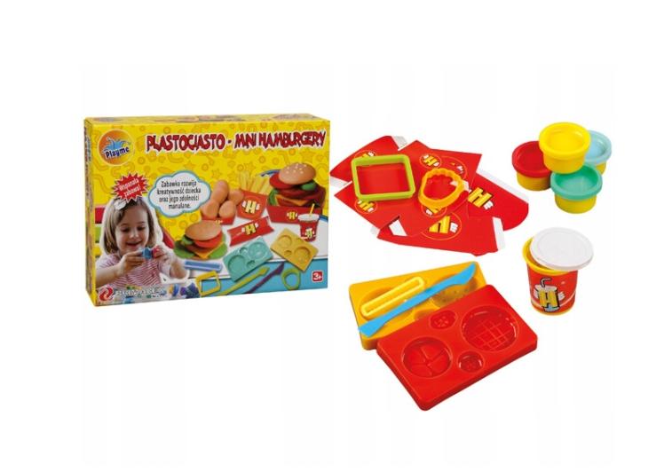 W zestawie: 1 forma do hamburgera, 3 foremki, 4 pojemniki z plastociastem, 1 opakowanie dla ciasta z jabłkiem, 1 opakowanie dla hamburgera, 1 opakowanie dla frytek, nożyk, kubeczek napju gazowanego, słomka. Wiek: 3+