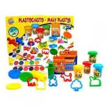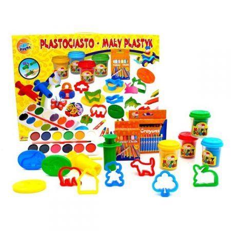 W zestawie: 1 wyciskarka, 2 wałki, 2 linijki z otworami o różnych kształtach, 1 szpatułka, 1 forma, 1 mata, 1 pojemnik z plastociastem z brokatem, 4 pojemniki z plastociastem Wiek: 3+