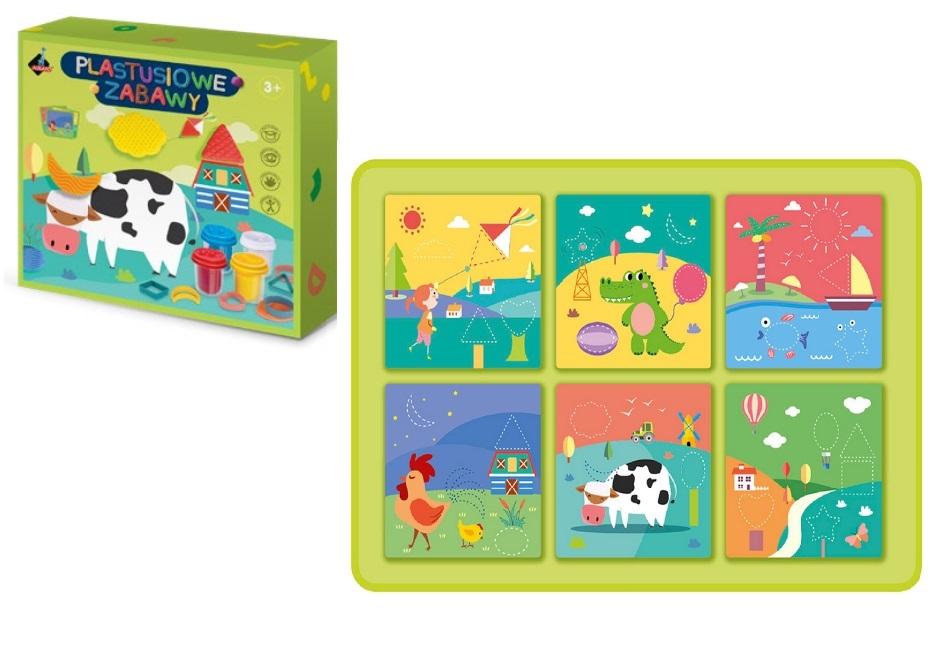 Zabawa masą plastyczną pobudza wyobraźnię i kreatywność jak również poprawia koordynację wzrokowo-ruchową. Ugniatanie i formowanie "ciasta" rozwija zdolności motoryczne dziecka, tak przydatne podczas pisania czy rysowania, a szczypanie, ściskanie oraz wałkowanie masy stymuluje zmysł dotyku. W zestawie: 6 obrazków, 4 kolory masy plastycznej (4x55g), 8 foremek, nożyk, 4 płytki do odcisków, kolorowa książeczkę z pomysłami wykonania.